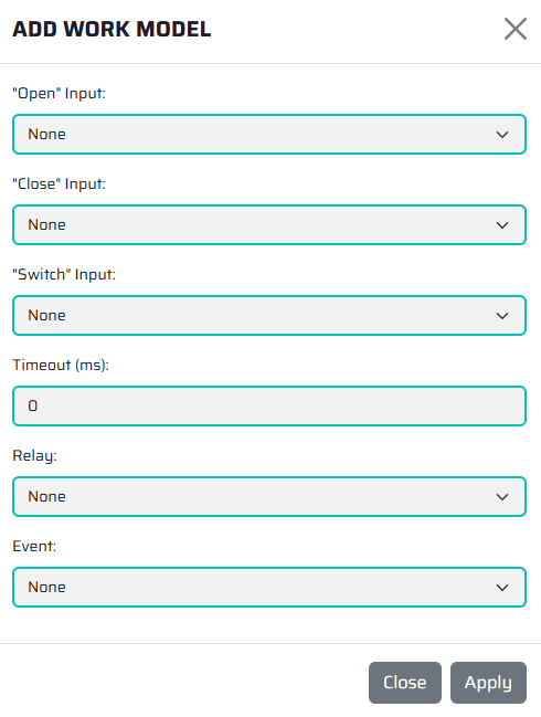 Описание полей, которые доступны для редактирования приведены в таблице ниже. Дискретный вход, при сигнале на котором срабатывает реле из поля Relay. Реле удерживается в таком состоянии, пока не появится сигнал на дискретном входе, указанном в поле "Close" Input. Реле автоматически вернется в исходное состояние через время, указанное в поле Timeout. "Close" Input Дискретный вход, при сигнале на котором реле возвращается в исходное состояние. Реле автоматически вернется в исходное состояние через время, указанное в поле Timeout. "Switch" Input Дискретный вход контроллера, при появлении сигнала на котором срабатывает реле, указанное в поле Relay, а при пропадании сигнала реле возвращается в исходное состояние. Реле автоматически вернется в исходное состояние через время, указанное в поле Timeout. Timeout (ms) Время, через которое реле автоматически вернётся в исходное состояние. Если в поле Timeout указано значение 0, реле не вернется в исходное состояние. Для закрытия реле необходимо подать напряжение на дискретный вход, указанный в поле "Close" Input. Relay Реле, которое активируется при возникновении Event (success). В выпадающем меню выберите реле, где: Event Событие, отображаемое в ПО Biosmart-Studio v6. Доступные значения:Поле Описание "Open" Input