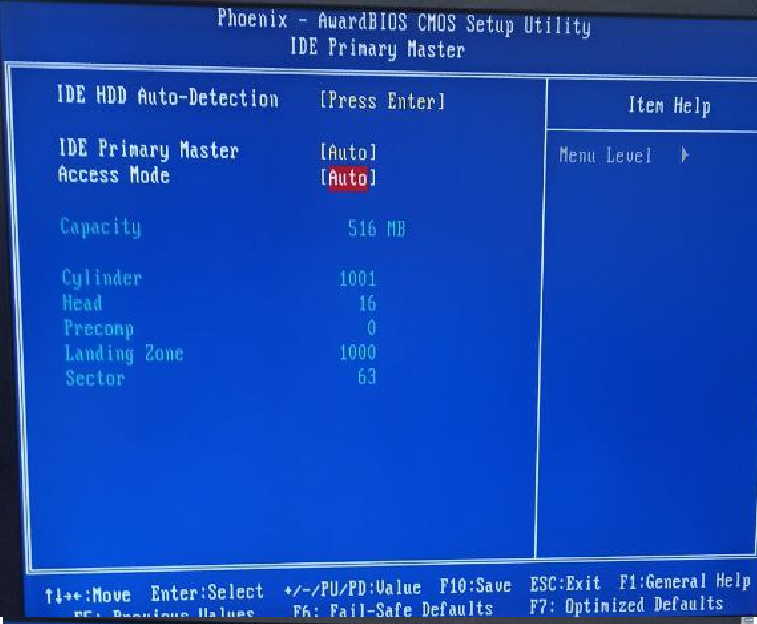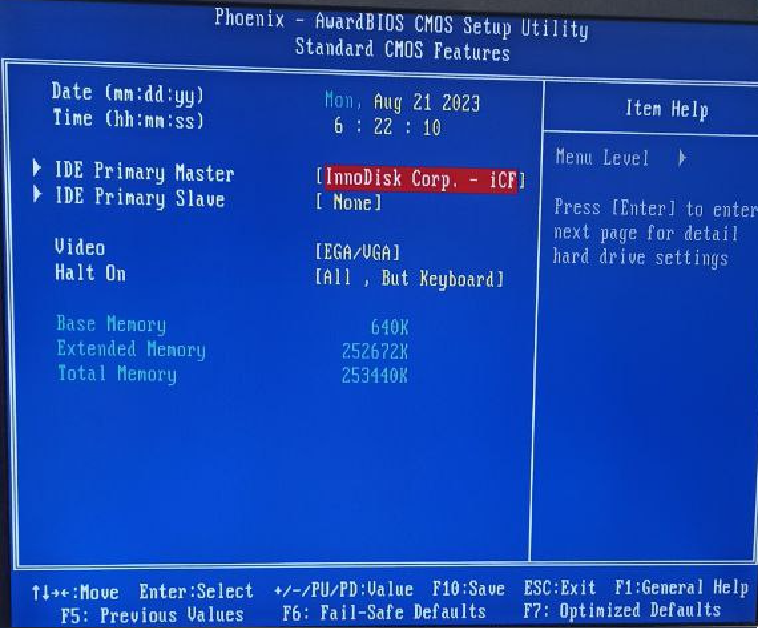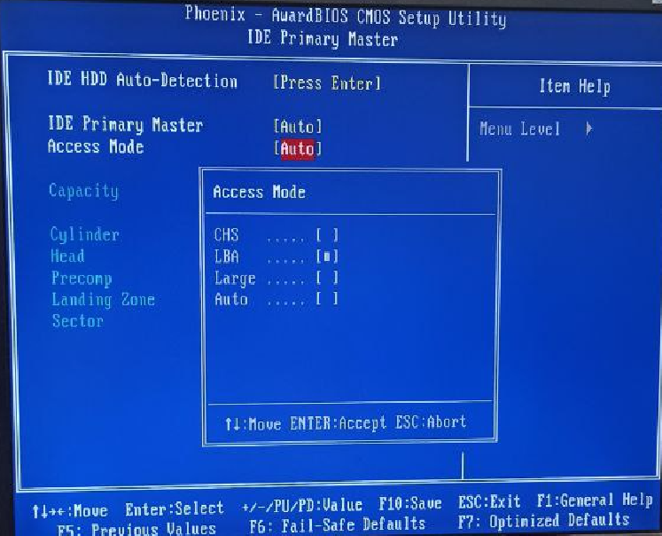 Во время загрузки нажимаете F8 (как для обычного ПК), далее нужно выбрать следующие настройки: "Standart CMOS Features -> IDE Primary Master [ICF 1SE2] -> Access Mode -> LBA" пример ниже на скриншоте.