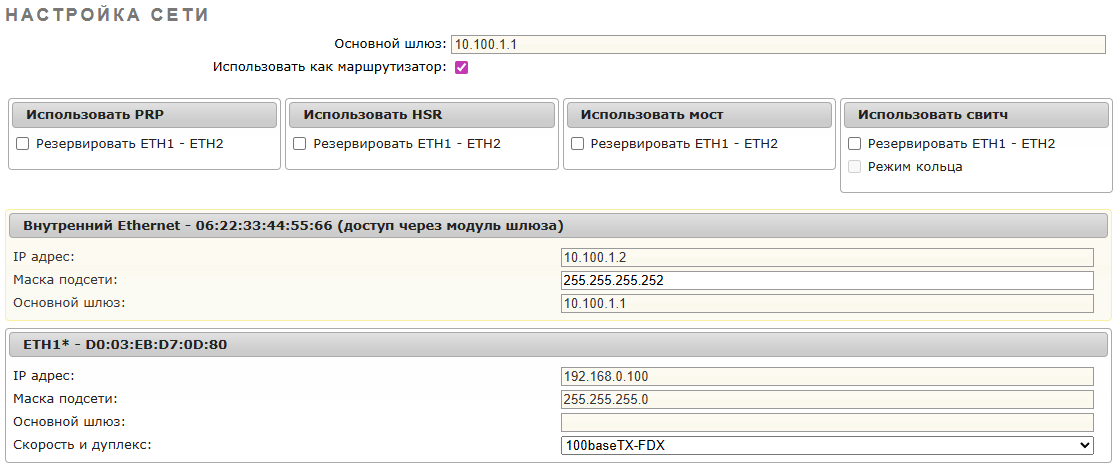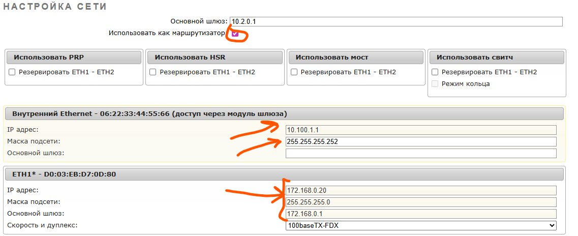 | Eth1 | Ip Внутренней сети на пример 192.168.0.1  | Шлюз внешней сети, может быть пустым -  | Маска задается в проекте, либо наладчиком 255.255.255.0  | |