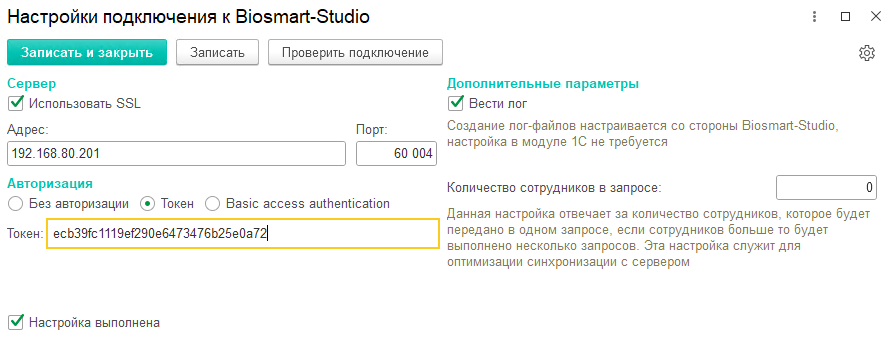 Поставите отметку в чекбоксе Использовать SSL для установки защищенного соединения между 1С и ПО Biosmart-Studio. Включите настройку Использовать SSL в программе Biosmart Admin.
