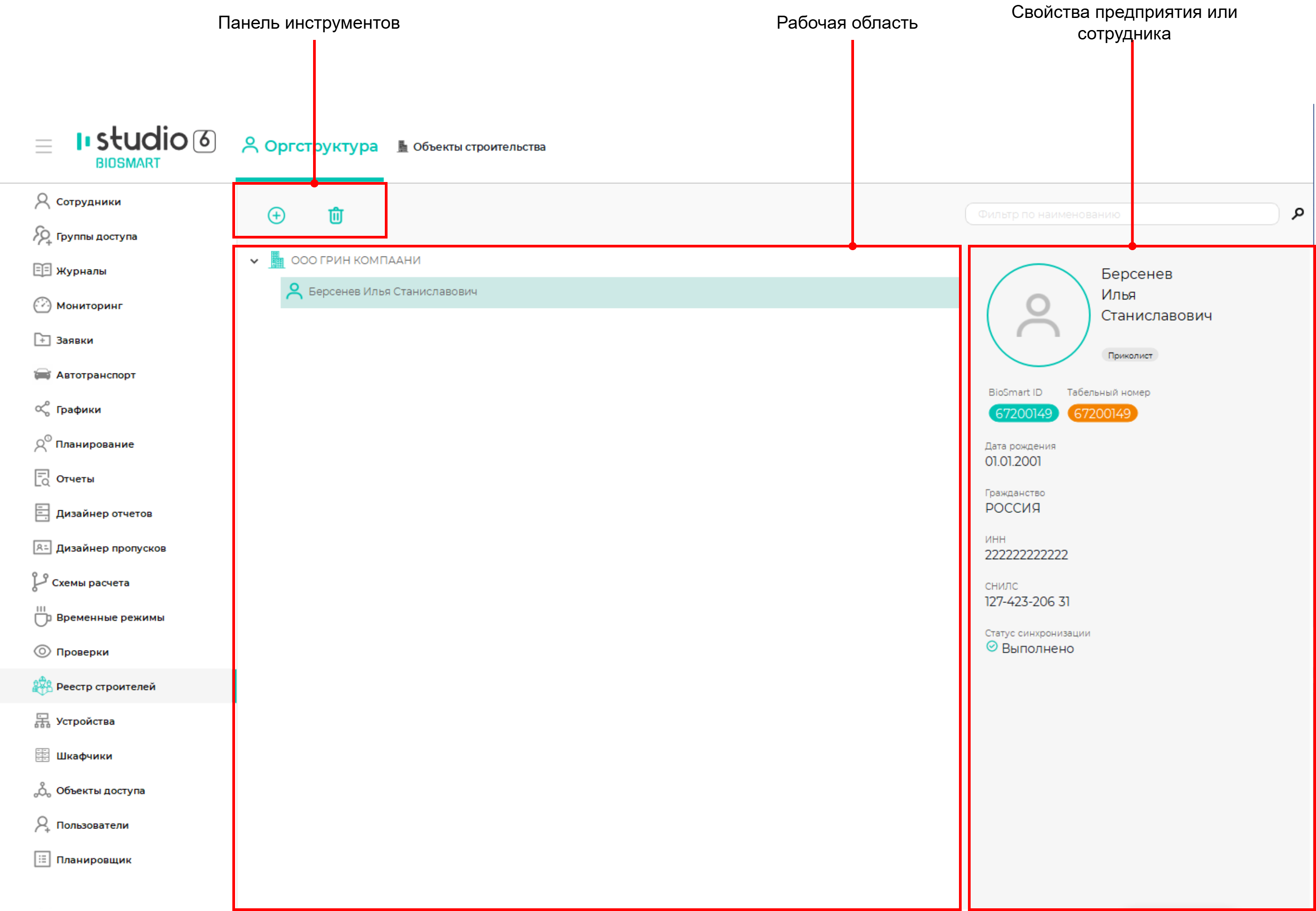 Раздел Реестр строителей предназначен для передачи данных об организации и сотрудниках из ПО Biosmart-Studio v6 в Реестр строителей АИС Цифровой двойник.