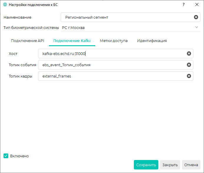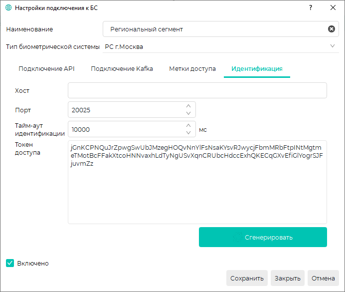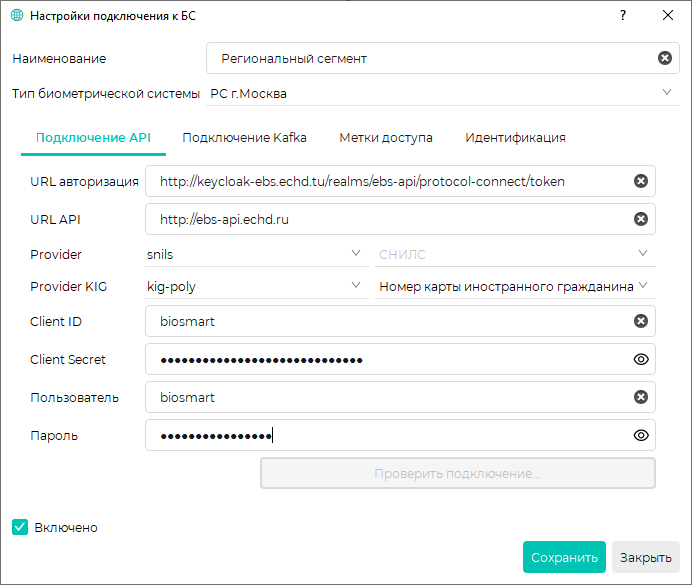 Для ПК с ОС Windows Если сервер Biosmart установлен на ПК с ОС Windows, то для подключения к API выполните следующие шаги: Для ПК с ОС Astra Linux Если сервер Biosmart установлен на ПК с ОС Astra Linux, то для корректной работы подключения к API регионального сегмента, выполните следующие шаги от имени администратора: Далее внесите IP-адреса, полученные от РС г. Москвы: Где ХХХ.ХХХ.ХХХ.ХХХ - IP-адреса, предоставленные РС г. Москвы Перезапустите сервер Biosmart: Данную настройку необходимо повторять после каждого обновления сервера Biosmart. Для подключения ПО Biosmart-Studio v6 к Региональному сегменту г. Москвы выполните следующие шаги: Перейдите в Основном меню в раздел Справочники → Профили БС, нажмите на кнопку Добавить, введите Наименование профиля БС и выберите Тип биометрический системы - РС г. Москва. На вкладке Подключение API заполните необходимые данные. Укажите адрес для получения токена авторизации, полученный от РС г. Москвы. В адрес, полученный от РС г. Москвы, необходимо добавить /ebs-api/protocol-connect/token. Укажите параметр, по которому будет выполняться сопоставление информации с Региональным сегментом. Доступные следующие значения: Укажите параметр, по которому будет выполняться сопоставление информации с Региональным сегментом. Доступные следующие значения: Client Secret На вкладке Подключение Kafka заполните данные. Укажите адрес и порт подключения в диапазоне 31000-31006 к брокеру сообщений Kafka. Адрес и порт подключения к брокеру сообщений Kafka указывается без сетевого протокола http/https в формате: kafka-ebs.echd.ru:31000. Укажите наименование топика в брокере сообщений Kafka, в котором вспомогательный сервис идентификации запрашивает результат идентификации. Для каждой организации должен быть назначен отдельный топик события. Наименование топика предоставляет РС г. Москвы. Топик события указывается в формате ebs_event_Топик_события. При наличии в топике события нескольких слов, впишите топик события с помощью нижних подчеркиваний. Укажите наименование топика в брокере сообщений Kafka, предназначенного для приема запросов на идентификацию. В данный момент по умолчанию используется значение external_frames. На вкладке Идентификация сгенерируйте Токен доступа для обмена информацией между терминалом BioSmart Quasar 7 и ПО Biosmart-Studio v6. Генерируйте Токен доступа перед первоначальным подключением и настройкой терминалов BioSmart Quasar 7. Если токен доступа сгенерирован после настройки терминалов BioSmart Quasar 7, то необходимо заново произвести настройку терминалов. Укажите IP-адрес Biosmart Server. Укажите порт для передачи данных с терминала BioSmart Quasar 7 в ПО Biosmart-Studio v6. Укажите максимальное время, выделенное на идентификацию. Если по истечении этого времени не будет получен ответ от регионального сегмента, на терминале отобразиться сообщение о неуспешной идентификации. Рекомендуемое значение: 10 000 мс. Сгенерируйте токен доступа для обмена информацией между терминалом BioSmart Quasar 7 и ПО Biosmart-Studio v6. Для этого нажмите кнопку Сгенерировать.