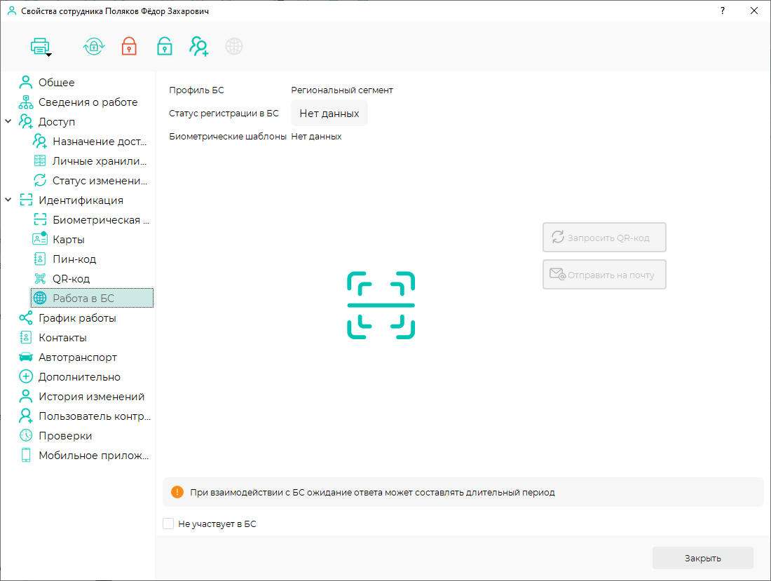 Перед началом валидации убедитесь, что у каждого сотрудника заполнены поля: СНИЛС и гражданство. Если сотрудник является иностранным гражданином, то на вкладке Дополнительно должно быть заполнено поле с номером карты иностранного гражданина. Для валидации выполните следующие шаги: В карточке сотрудника перейдите в раздел Работа в БС. После валидации проверить статус регистрации в БС можно двумя способами: